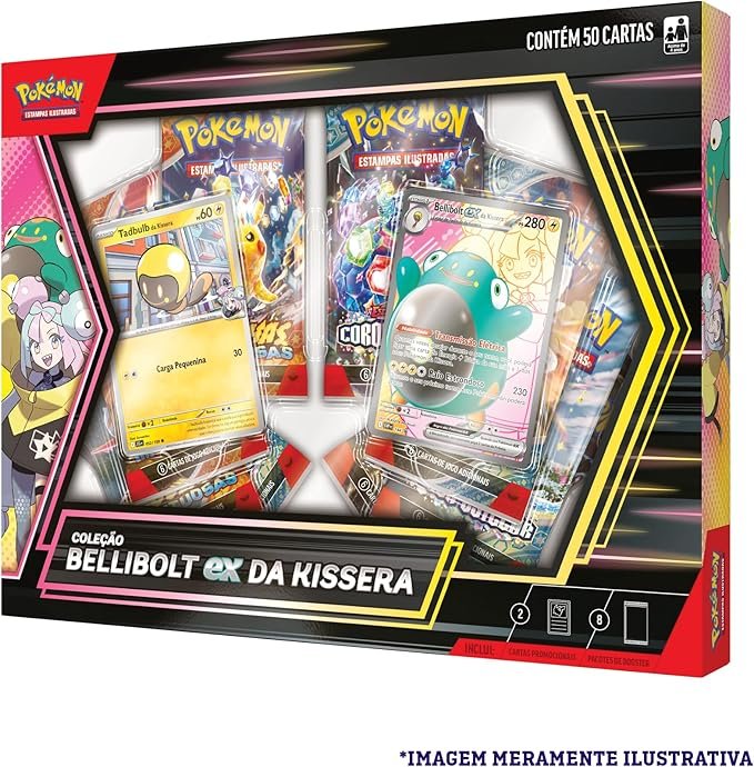 A Box Coleção Bellibolt ex – Kissera destaca o poderoso Bellibolt ex e sua Habilidade Transmissão Elétrica, ideal para fortalecer equipes da Kissera no Pokémon TCG. Acompanha 8 boosters para ampliar a coleção e garantir partidas ainda mais eletrizantes.